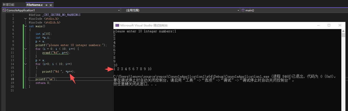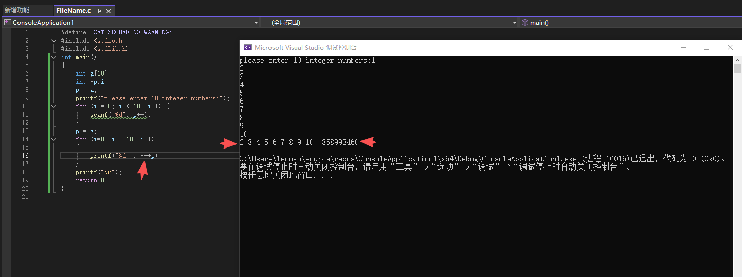 而如果换成了*++p,就会先取a[1]而不是a[0],那第10轮的时候就会取到无法想象的值了。等价于*(++p)。