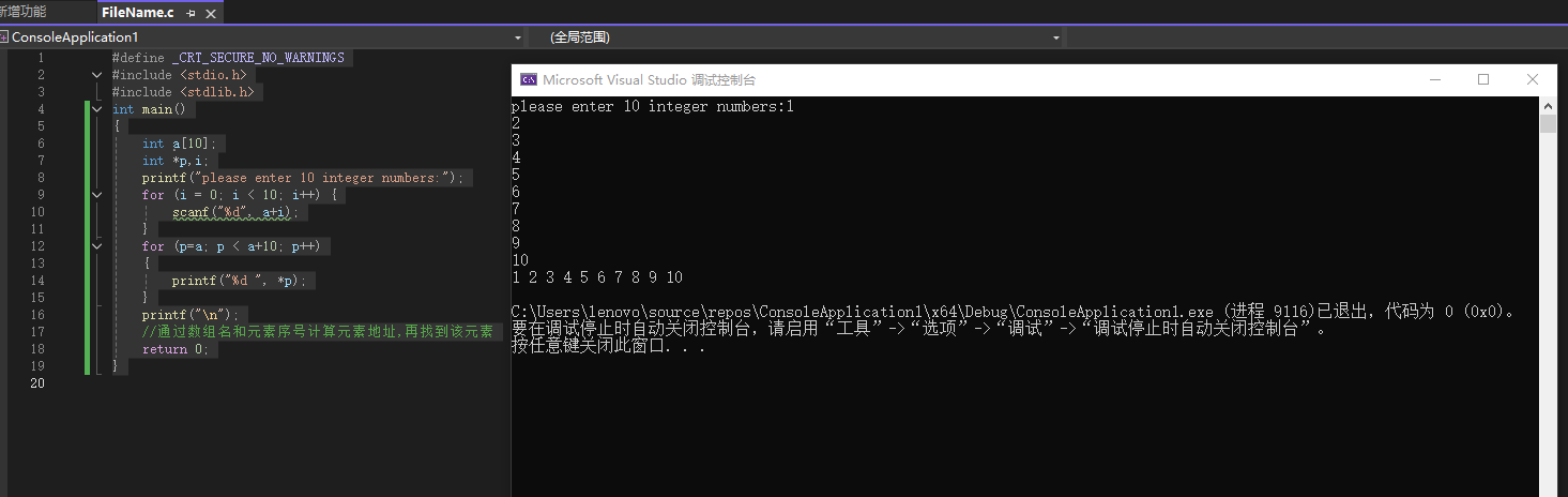 12.5.1、实参使用数组,形参使用指针,代码如下所示: