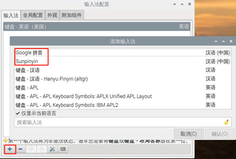 打开之后点击左下角的加号+,把Google拼音或者Sunpinyin选中并且点击确认。