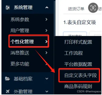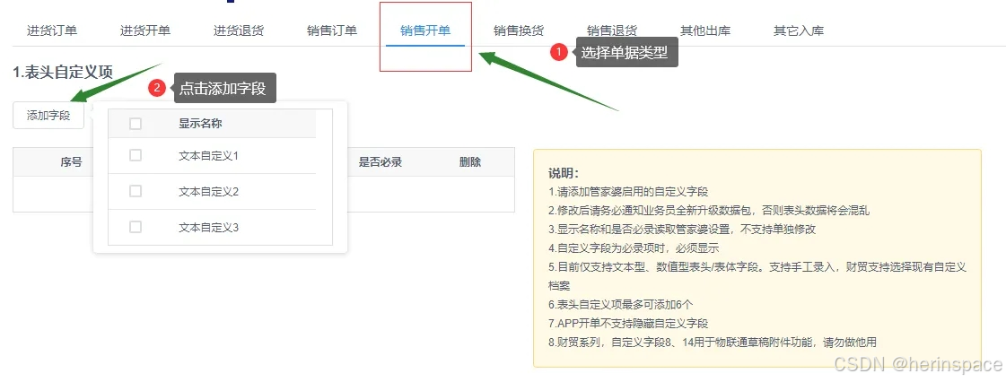 登录进入物联通后台,点击系统管理-个性化管理-自定义表头字段进入,进入后先选择单据类型,再点击添加字段,这里会显示管家婆中已经启用的单据的表头自定义字段(文本类型),然后勾选需要在手机端录入的字段即可。