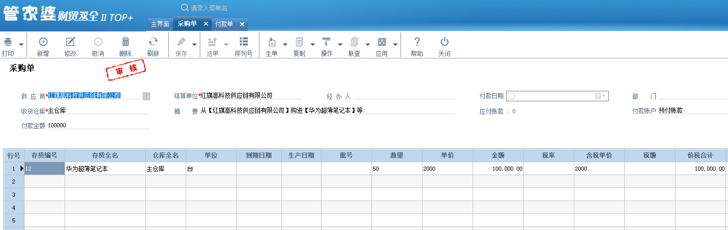 1,先做采购单采购固定资产,采购单上付款账户选预付账款,金额录入10W(该步骤主要用于冲抵期初预付账款金额),生成凭证:借:库存商品 贷:预付账款
