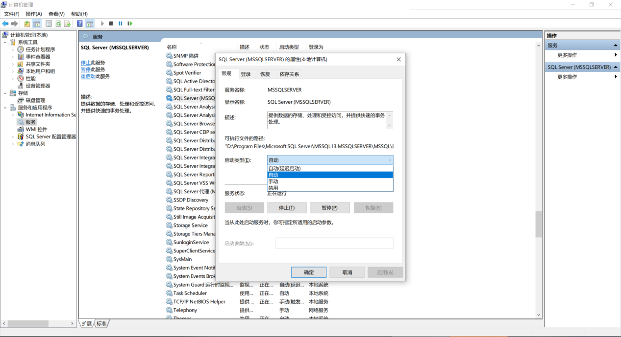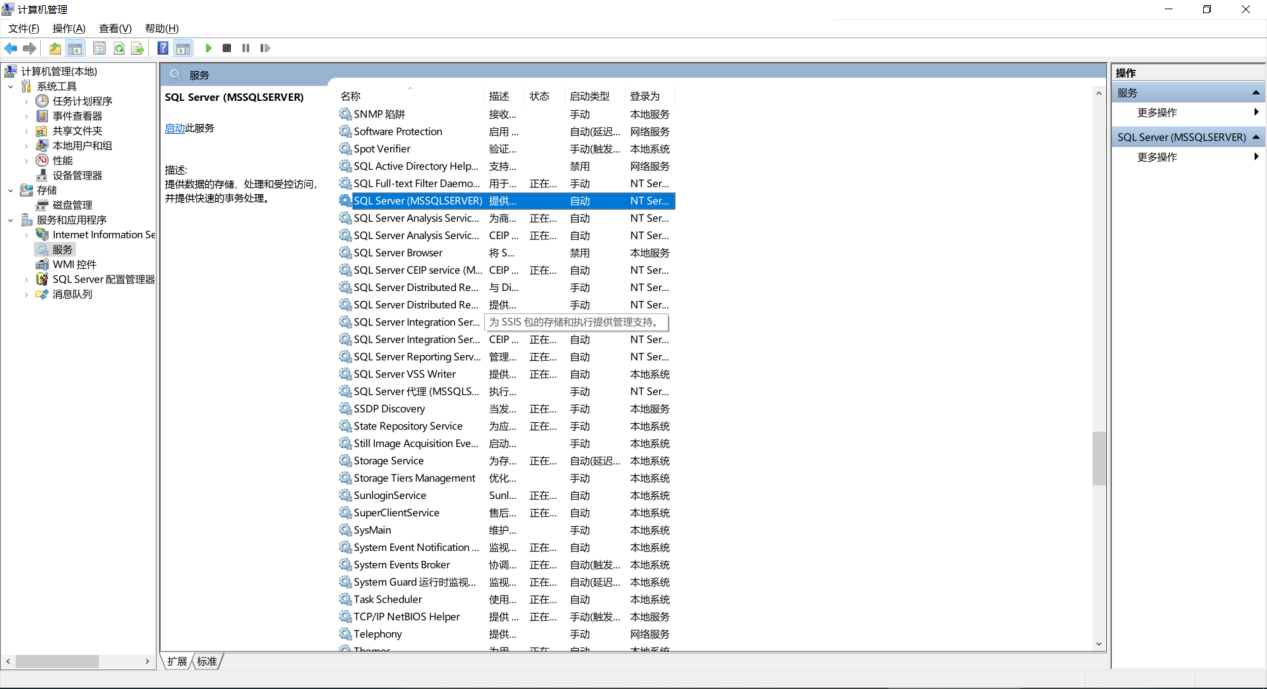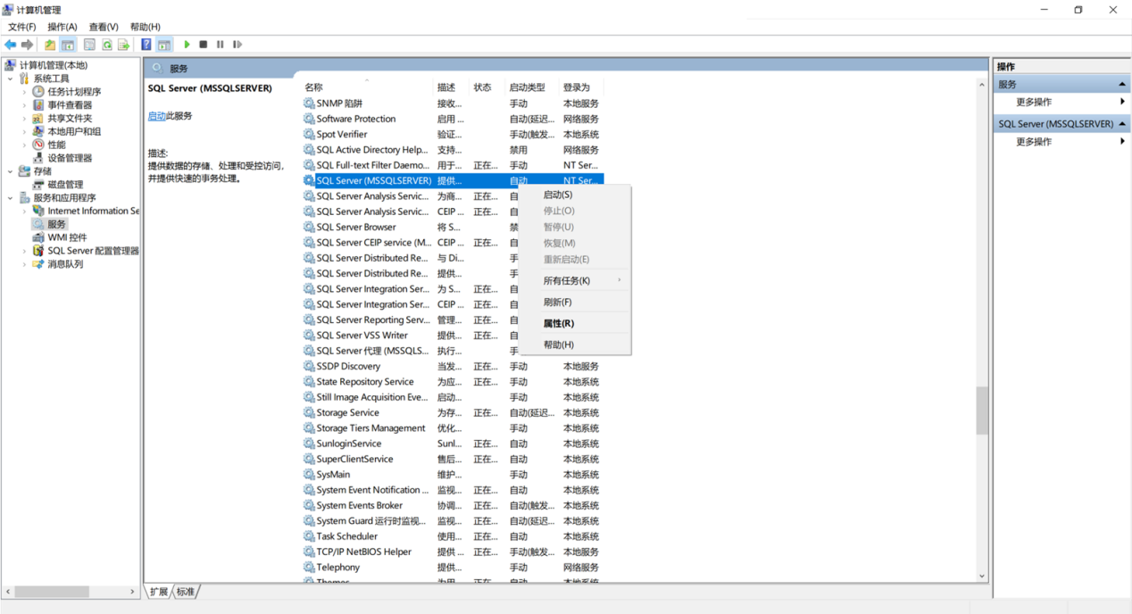 电脑桌面右键“我的电脑”图标选择“管理”,进入管理菜单后选择“服务和应用程序”-“服务”。在服务列表中找到SQL Server,右键点击并选择“启动”。