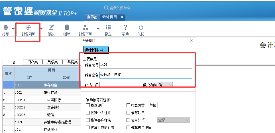 若需新增科目编号为1408 科目全名为委托加工物资的一级科目,点击页面上方的新增统计按钮。在弹出的 “会计科目 - 新增” 窗口中填写科目编号和科目全名以及其他必需的信息,填写完成后点击【保存】,一级科目委托加工物资就添加成功。