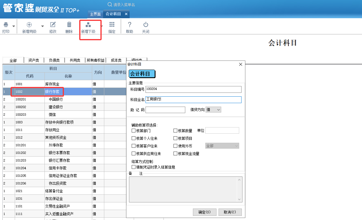 若需在已有科目下新增明细科目,例如在 “1002 银行存款” 下添加 “100201 工商银行”,选中父级科目“1002 银行存款”点击上方的新增下级按钮,在 “会计科目 - 新增” 窗口中填写科目编号和科目全名以及其他必需的信息,填写完成后点击【保存】,下级科目将自动归属到对应父级科目下。