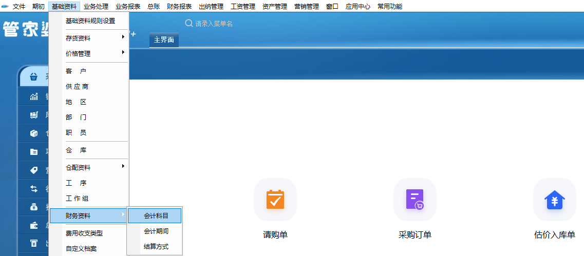 登录管家婆财贸 ERP 系统,软件上方依次点击基础资料-财务资料-会计科目进入会计科目管理页面。