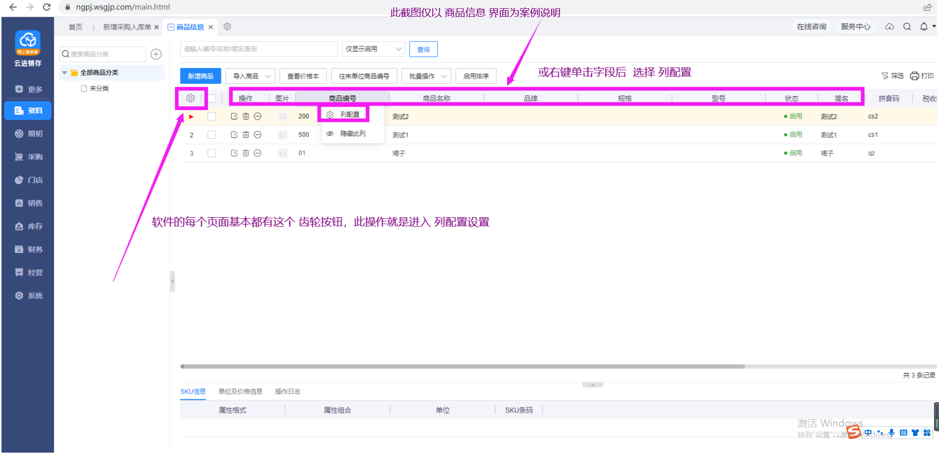 小编以商品信息调整列配置为例演示一下管家婆网店ERP中如何设置列配置,商品信息页面点击列名称行前面的小齿轮或右键单击字段选择“列配置”进入列配置设置界面,进入后下拉找到需要的字段进行设置显示或不显示即可。