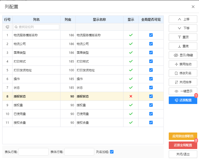 软件大部分页面都支持此操作,如果觉得当前显示字段不需要或有需要的字段在当前页面没显示,都可以通过列配置进行设置(隐藏字段也可以通过右键列名称选择隐藏此列)。