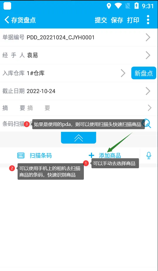 2,手机端开盘点单选择仓库,会先校验选择的仓库是否有在分量盘点准备。确认无误后录入商品以及数量,录入完成后提交单据即可