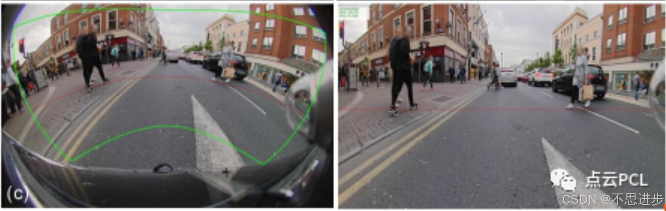 相对于woodscape柱面图的转换,优势是盲区范围更小,转换过程不需要鱼眼相机的畸变参数,只需要相机内参中的主点和相机的外参角度即可