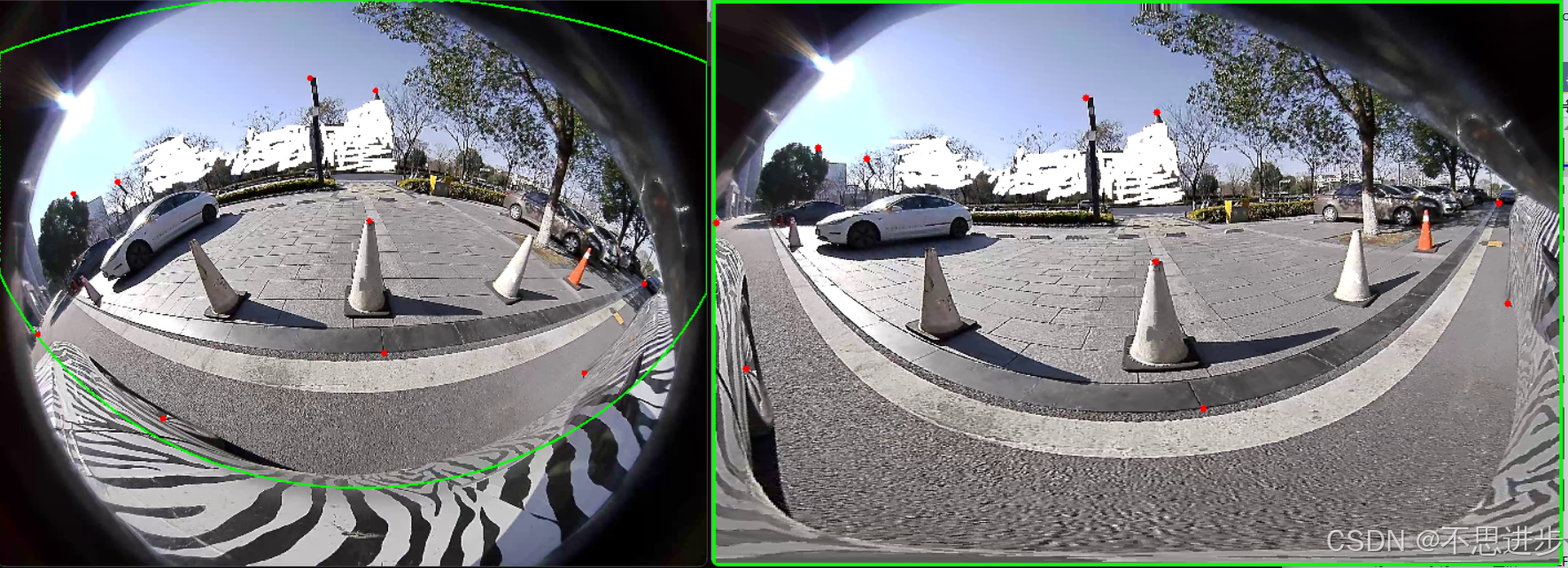 1、左侧为鱼眼原图,右侧为转换出的柱面图,右侧柱面图的边框(绿色点)映射回左侧原图绿色点(原图中绿线围起来区域代表转换的范围)。