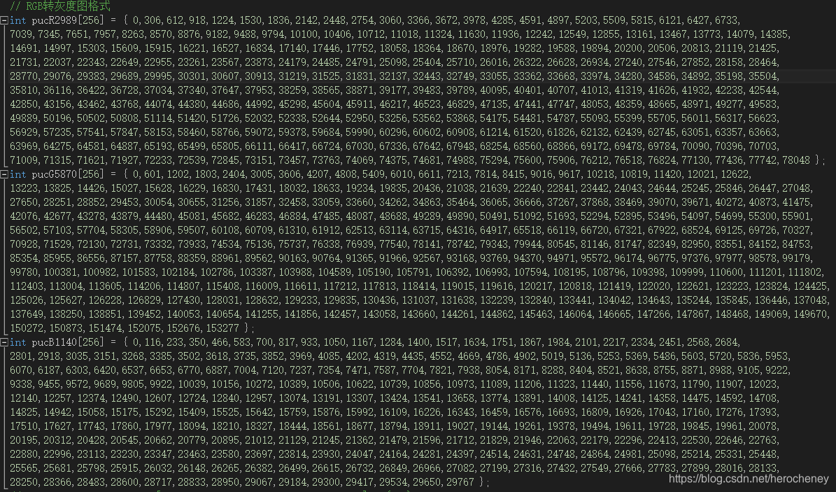 当我们将Matlab代码转成C语言时,C程序经常会需要定义一些常数数组,目的是为了优化代码的执行效率,避免大量的不必要的运算。例如,当我们进行图像灰度化时,公式为Gray = 0.2898R + 0.5870G + 0.1140B,小数的计算与乘法的计算,极大地拉低了硬件的计算效率,增加了耗时,为了减少计算耗时,可以使用Matlab将0-255的像素值预先扩大1024倍,并乘以R/G/B各自的系数,变为整形的运算,并且根据不同的像素值,通过查表的方式,就能快速地查找到乘法的计算结果。例如: