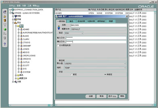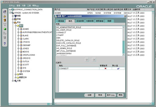 (1-1)创建用户: 在登陆后,点安全,在第一项,你就会看到用户,用右键你可以创建新用户,或者给用户授于角色,不同的角色拥有不同的权限!oracle8i预定义的角色,我在下面会讲。看看下边我抓的图吧,在一般信息后面的角色,你就可以赋予connect,resource权限。