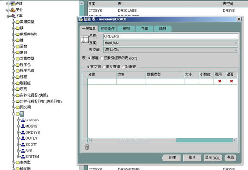 (1-2)创建数据库: 咱们先断开system的数据库连接,可以在文件中选择,也可以用右键。然后用我们创建的用户来登陆,并且在方案中找到表,然后就可以直接创建,由于是图形可视化,而且又是全中文的,我就不缀述了!!大家可以多试试!