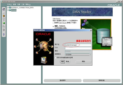 小试牛刀oracle 8i(顺便我们练练手)(为了方便,我就将oracle 8i简写8i了) 8i和9i确实有些不一样,不过在界面上区别不大,还是以我的oracle 8i为例为大家讲解一下吧!既然是实战,首先我们为自己新建一个开发用户,并创建一个表!! 在oracle里创建新用户和表的方法比较多,只要你有管理员的权限(废话!),首先用最简单的,在8i的程序组中启动DBA Studio程序项,在出现的数据库链接信息中输入管理用户名和口令即可,当然,在oracle中,你可以用用户名斜杠口令的方法登陆,连接身份选SYSDBA。