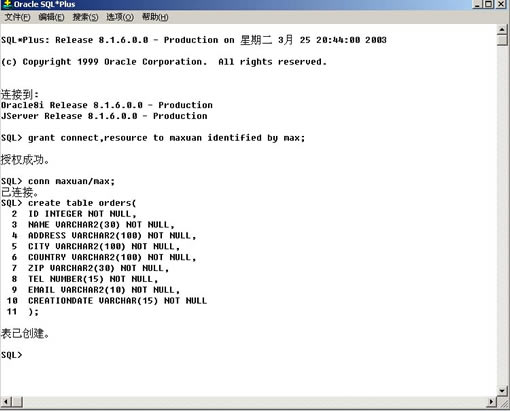 下用我用一张截图说明所有的操作,这里做一下说明: 在登陆进去后,出现“SQL>”我们就可以在它后面书写SQL语句,grant connect,resouce to maxuan identified by max,这一句是创建用户maxuan,口令为max,并赋予connect,resource权限,在出现授权成功后,我们用conn maxuan/max这句来以maxuan连接数据库,这时的角色已经不是DBA了!接下来的是些基本的SQL建表语句,不用多说了,在sqlplus中,每条语句结束用分号标识,在完成后,我们可以用quit或exit命令断开