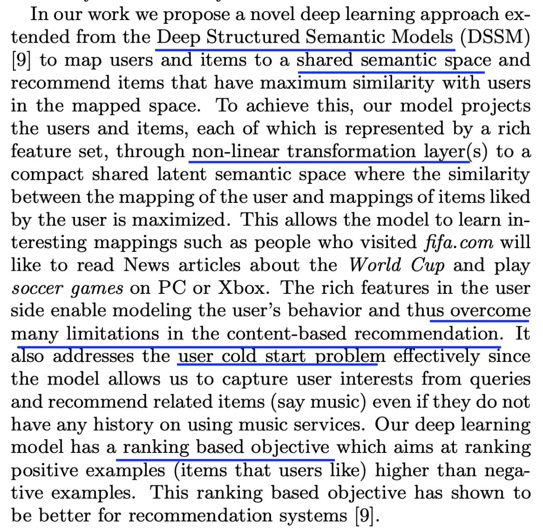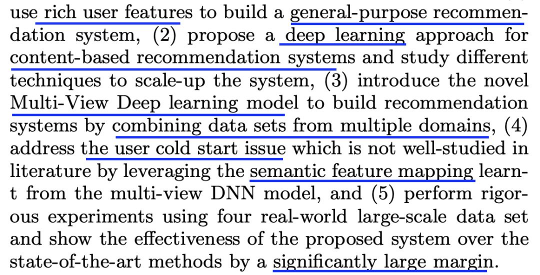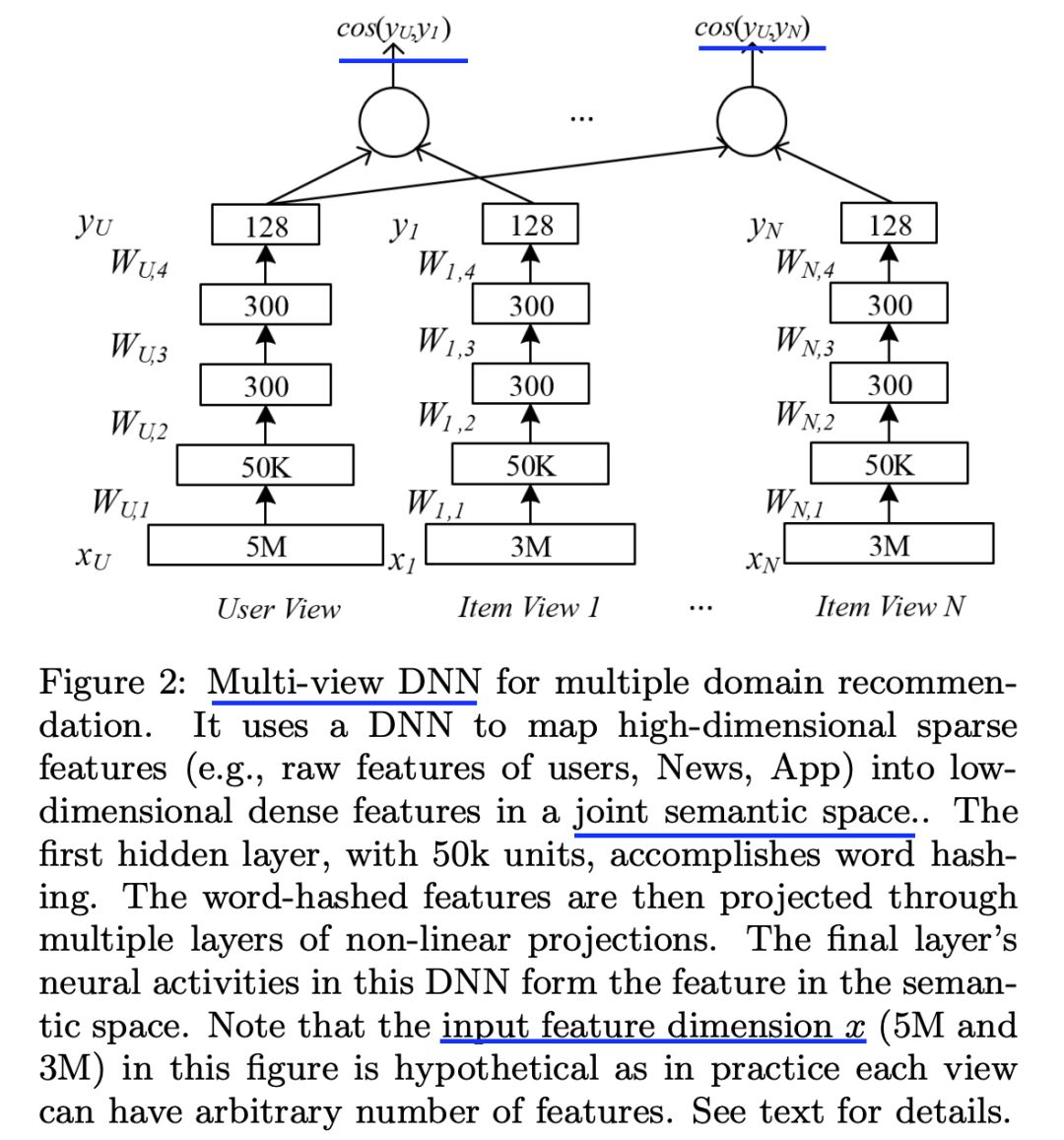 作者们利用深度学习方法将用户和商品映射到隐空间,在该隐空间中,用户和他们喜好的商品之间的相似度最大化。然后将这种模型加以扩展,引入一种多视角深度学习模型,进而可以对不同域的商品特征和用户特征进行联合学习。