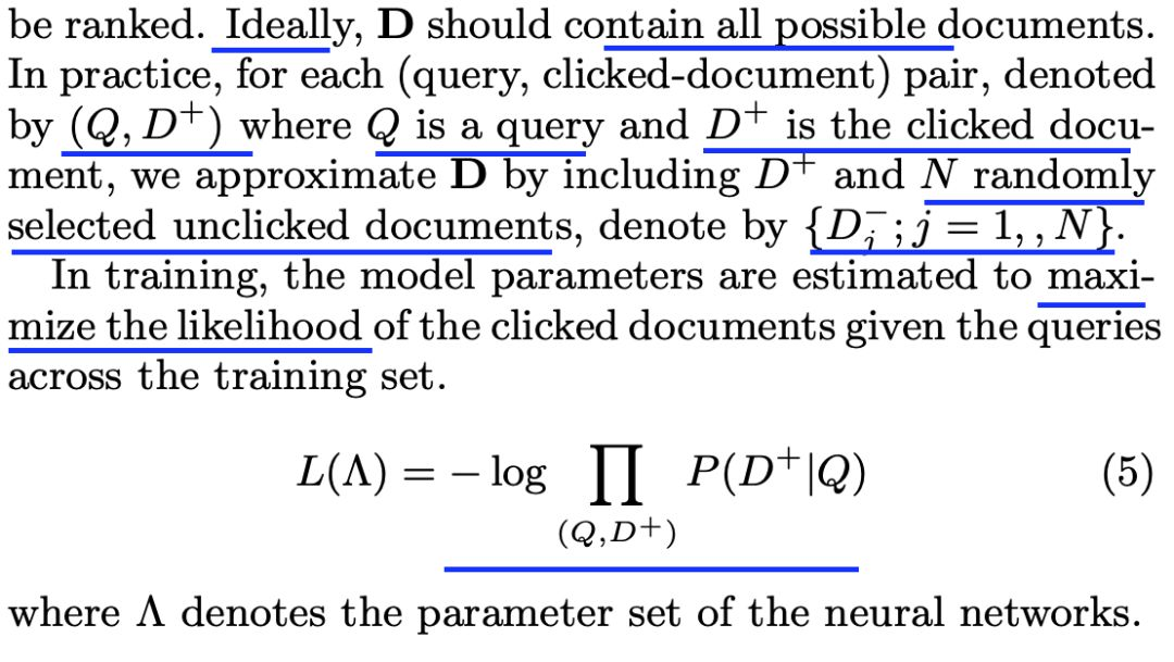 发生点击的文档标记为正样本,未发生点击的文档随机选择一部分作为负样本,在训练时目标为最大化似然概率