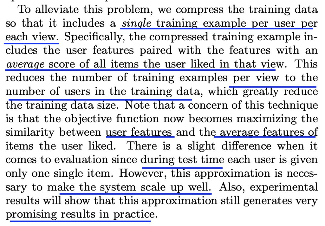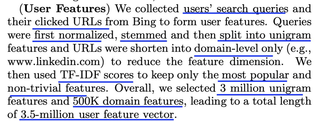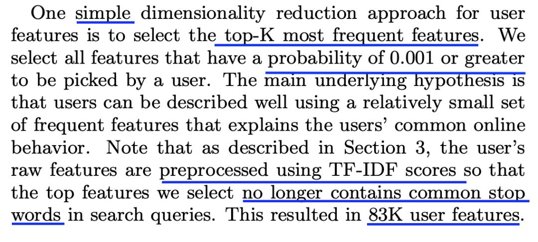 针对这些丰富特征的用户表示,作者们通过对输入进行降维和缩减训练数据的量来使其可扩展。只要用户具有足够的搜索和浏览历史,这些丰富的用户特征表示有助于模型学到相关的用户行为模式。