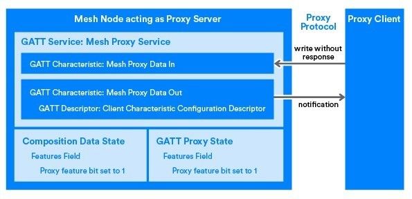 需要注意的一点是,任何蓝牙mesh节点(而非只有代理节点)都可以实施代理协议,从而支持基于GATT连接的直接交互。这在启动配置(provisioning)场景中非常有用。