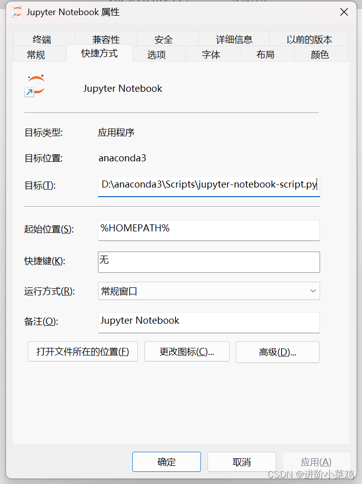 找到jupyer的快捷方式,打开属性,删除“目标”后面%后的所有内容