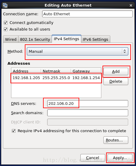 DNS servers DNS服务器,参考实现系统中的设置,这个比较关键,如果配置的不对,就上不了外网(不能使用域名访问网站),