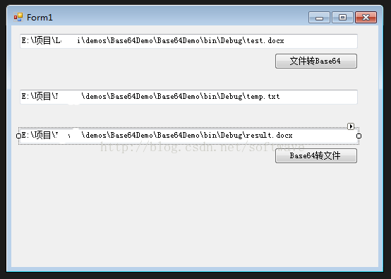 第一个文本框是源文件地址,第二个文本框是存放Base64码的一个文本文件,第三个文本框是解码后的文件路径。