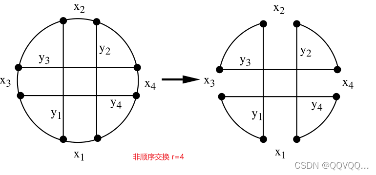 通常,可以通过适当编号受影响链路作为顺序交换来实现旅行的改进。但是,情况并非总是如此。下图显示了一个无法进行顺序交换的示例。