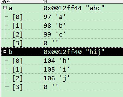 下面是为a和b数组输入3个字符后(分别是abc和hij),利用单步执行看到的结果: