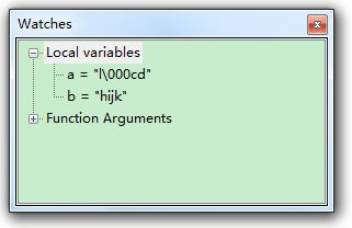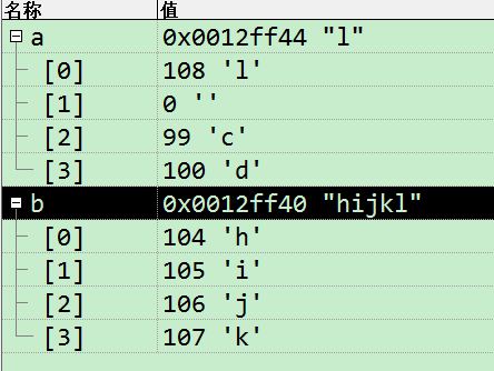 下面是为a和b数组输入5个字符后(分别是abcef和hijkl),利用单步执行看到的结果: