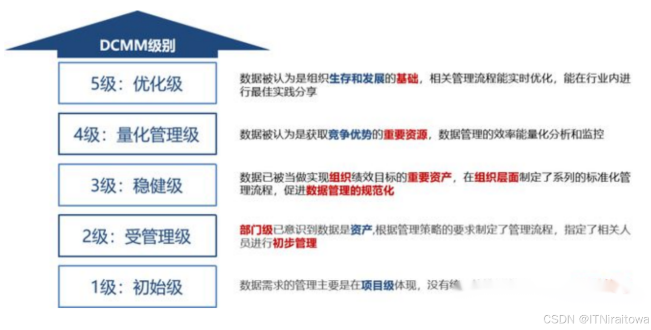 DCMM将数据管理能力成熟度划分为五个等级,自低向高依次为初始级(1级)、受管理级(2级)、稳健级(3级)、量化管理级(4级)和优化级(5级),不同等级代表企业数据管理和应用的成熟度水平不同。