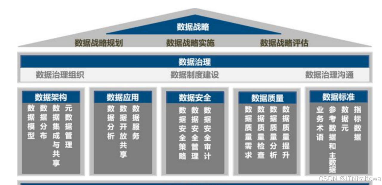 DCMM国家标准结合数据生命周期管理各个阶段的特征,按照组织、制度、流程、技术对数据管理能力进行了分析、总结,提炼出组织数据管理的8大能力域,并对每项能力域进行了二级能力项(28个能力项)和发展等级的划分(5个等级)以及相关功能介绍和评定指标(441项指标)的制定。