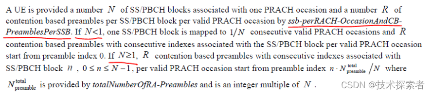 解释下上面这段协议描述:假设一个RO对应N个SSB并且每个SSB在每个RO内对应R个基于竞争的preamble。如果N<1,则意味着1个SSB对应1/N个连续的RO并且每个RO对应R个基于竞争的preamble,preamble index从0开始;如果N>=1,意味着一个RO里面映射了多个SSB并且每个一个RO内的SSB映射R个基于竞争的preamble,对于SSB n (0=<n<=N-1)对应的preamble index 从n*N_total_preamble/N开始。说的比较抽象,看两个例子吧。