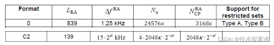 这些参数里面前三个标红色的没什么异议,对于后面4个标黄色的参数是有说法的,主要体现在不同preamble(839 or 139)长度情况下理解有差异,最明显的比如“1个subframe有多少个PRACH slot”和“一个PRACH slot有多少个PO”这两个参数,看看下面两个例子,对于长preamble format 0这两项无值,而对于短preamble format C2,这两项是有值的。