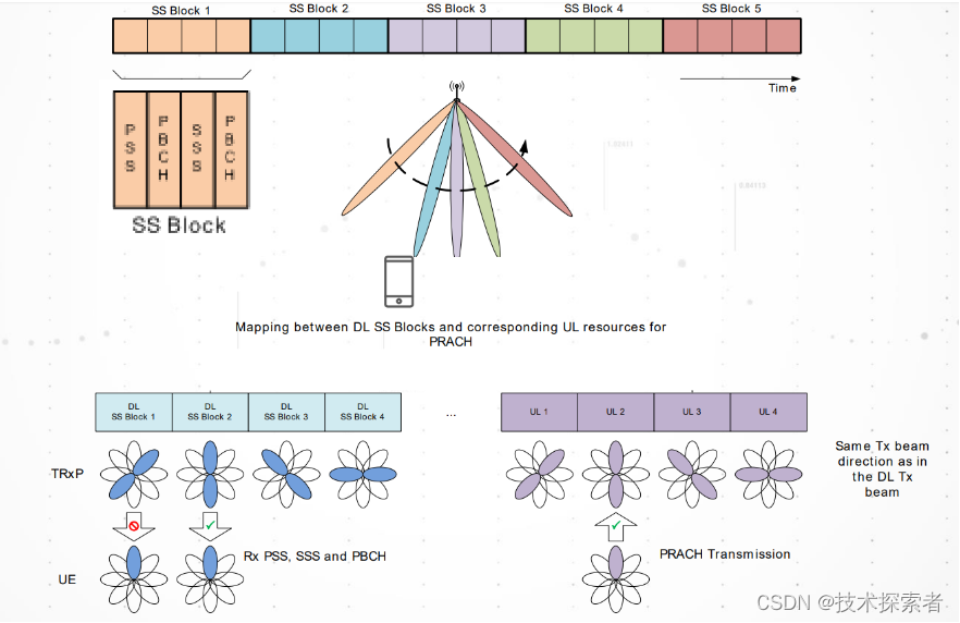 - 3)终端根据刚才最佳的SSB2接收beam方向,反过来在这个方向上发送PRACH,根据上面说的PRACH与SSB index的关联关系选择PRACH或preamble资源,这样基站收到PRACH preamble就会根据映射关系,反推出下行SSB 2是最这个终端最好的下行beam,以后的给这个终端的下行传输都在SSB2上做。