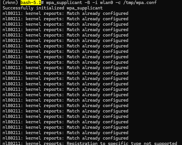 如果出现 Match already configured,这是之前多次执行了 wpa_supplicant 而没有显式停掉,有多