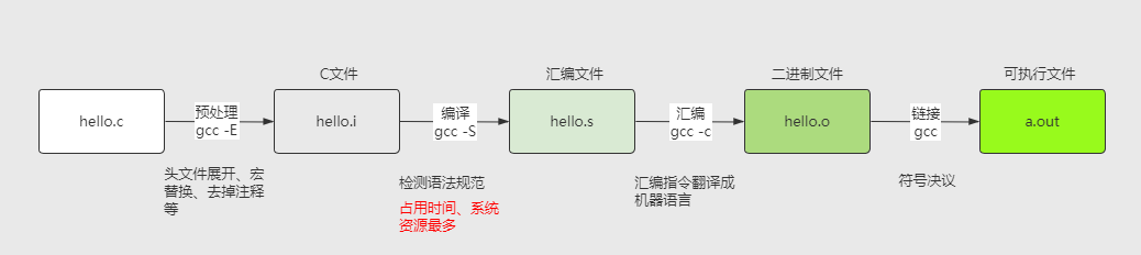 | gcc -E 文件名.c -o 文件名.i | 对.c程序文件进行预处理得到.i预处理文件 |