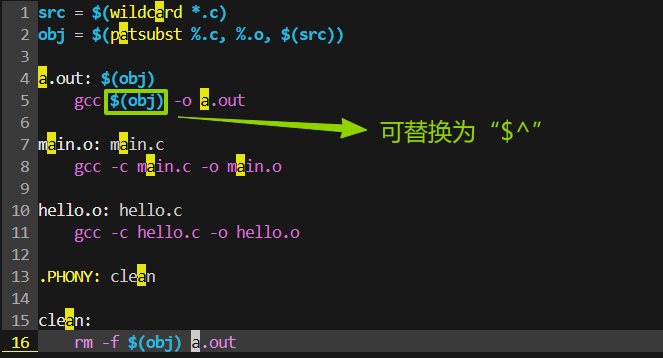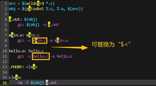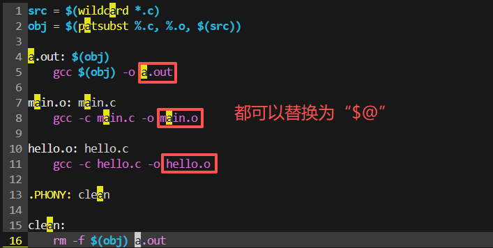 这样的话,就会发现存在main.o:main.c和hello.o:hello.c的命令是一样的,存在冗余,这时就可以通过模式规则,使用“%.o:%.c”将“目标文件:依赖文件”的原格式替换。