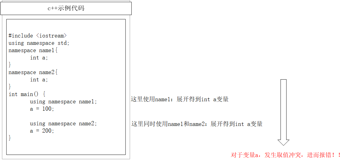 由于代码“using namespace”表示的是将某个命名空间中的所有定义“展开”到当前作用域中,所以这里要注意到不同的命名空间在using的过程中会出现相互覆盖的影响,实际使用应该规避,下图是我对这种影响的解释图: