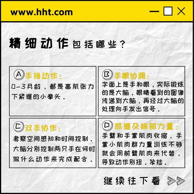 在我们的脑中枢神经内,有一部分专门掌管手部动作,手部动作越精细,与之对应的大脑神经元也就越发达。作为儿童智能的重要组成部分,精细动作还是衡量儿童神经系统发育的一个重要指标。