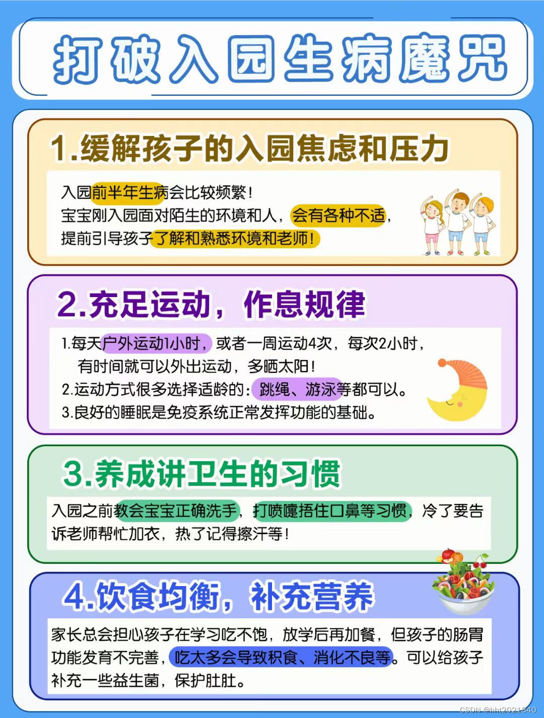 随着早晚温差变化,宝宝入园后可能因环境改变和接触增多而易生病。为了帮助宝宝更好地适应幼儿园生活,家长应注意培养规律的作息习惯和均衡饮食。做好这些准备,能有效增强宝宝抵抗力,成为健康的小全勤生。