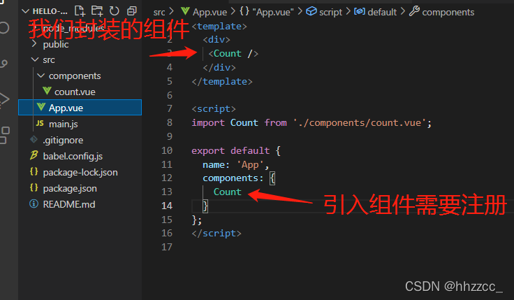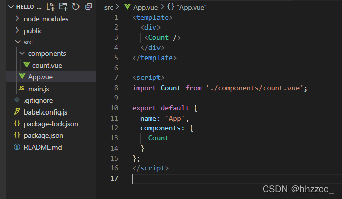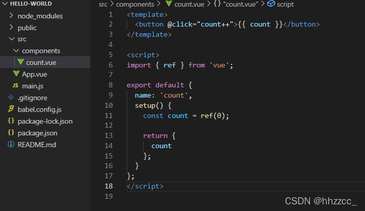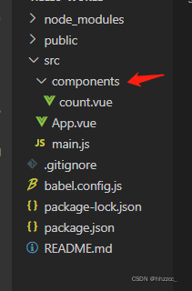 我们增加一个点击自增的功能,现在我们想把这个功能封装成组件,我们先创建一个components文件夹(专门用来放公共组件的文件夹,我习惯这么命名,通俗易懂),然后在里面创建一个count.vue文件,这就是我们的组件文件啦,如下