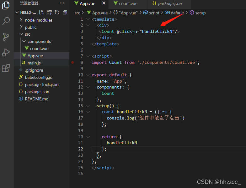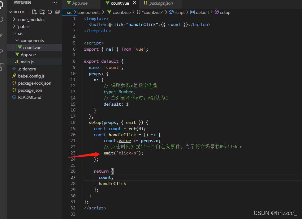 我们把组件点击后的流程抽离成一个函数,然后向外抛出一个事件click-n(事件的命名我习惯用中划线,setup中获取props变量需要用props.xx的方式,如果是在dom上就不用多加props.),在页面中我们可以和接收其他原生事件(如click事件)一样接收这个事件,如下