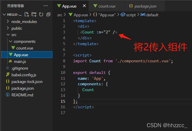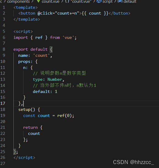 看起来增加了些东西,其实很好理解,我们提取一个变量n,用来管理自增时的数量,可以看到当n=2时,就符合题意,每次点击加2,所以我们把变量n当成props,让外部来决定我每次点击要加多少,可以看到props变量中有两个参数(这两个比较常用,建议每次定义props都写),type表示n是什么类型,很显然是数字类型,default是默认的意思,就是当外部不传n时,n的默认取值(有了default可以防止组件在没传参的情况下出现异常,相当于做了一次兜底,是很重要的一个性质)。我们返回的组件调用方,像组件中的props变量n传2,如下