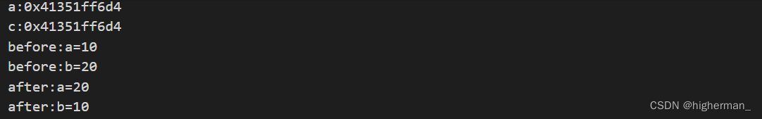 从上述代码运行结果可以知道,引用其实就是变量的一个别名,在内存中代表着同一块区域;而且当函数未调用之前,实参a,b的值分别是10和20。在函数调用的过程中,形参的值发生了交换,结束后实参的值被修改。即函数调用时,作为形参的的引用变量并不分配新的内存空间,它将作为实参变量的别名与其公用内存。