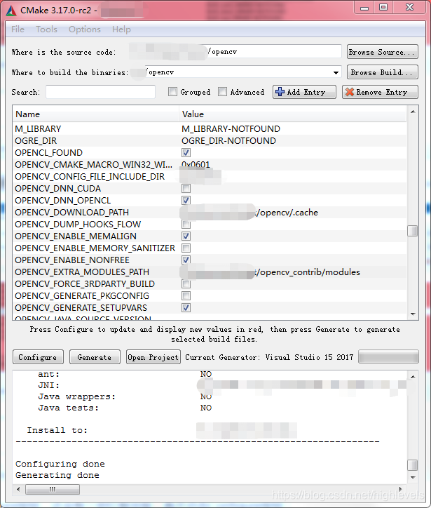 5.打开CMake,选择opencv源码文件夹与生成项目的文件夹。