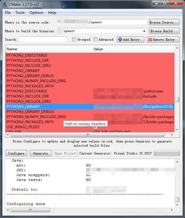 9.找到PYTHON3_NUMPY_INCLUDE_DIRS选项,选择"python路径/lib/site-packages/numpy/core/include"文件夹。
