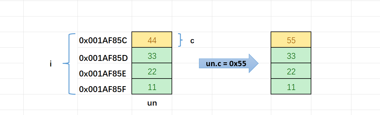 ②再对联合体中的 a 进行赋值,将覆盖 i 的一个字节大小的值。
