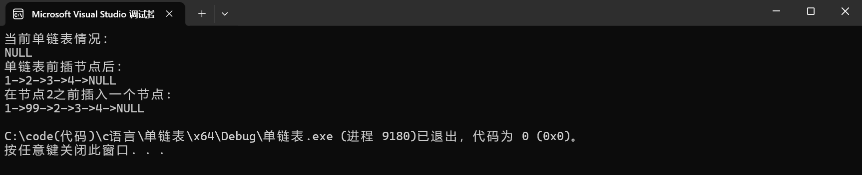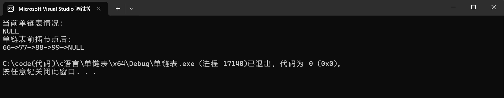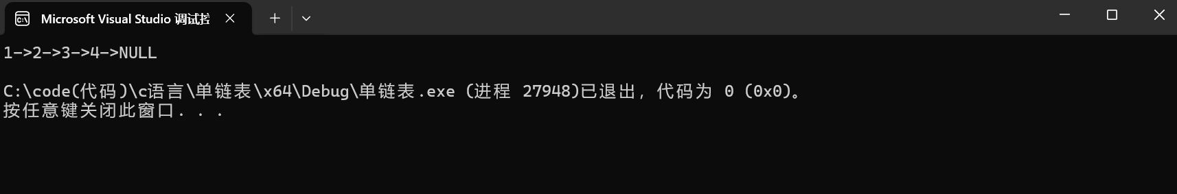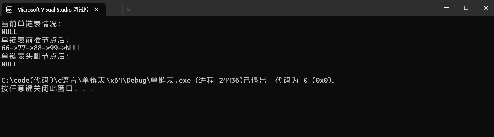 核心代码:通过phead=phead->next,不断进行更新头节点phead的指向,达到while循环遍历整个单链表,使用phead为循环判断条件,当phead为空时,跳出循环,并打印NULL。