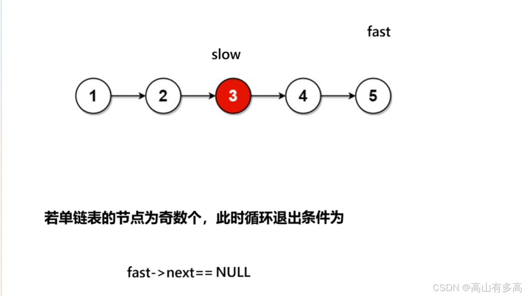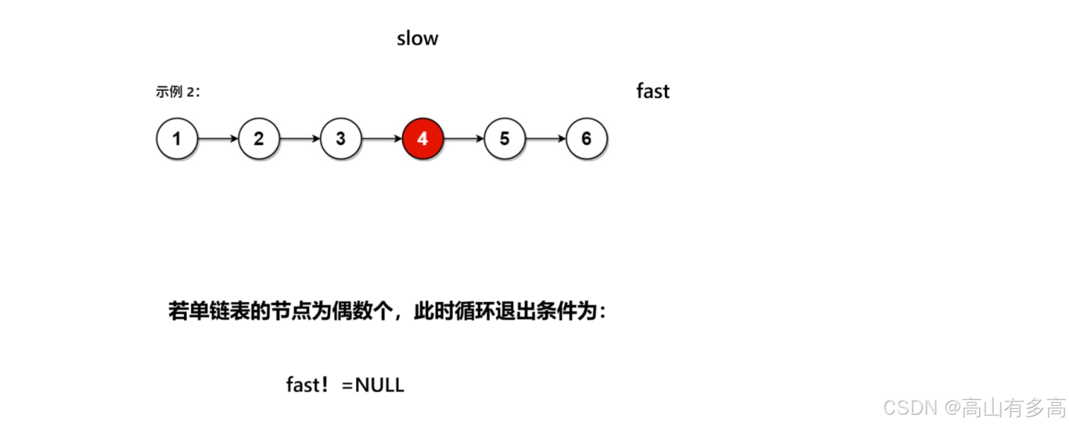 如果是偶数个节点就会出现对空指针解引用,但如果写成while(fast && fast->next)会因为第一个条件为空而直接退出,不会判断第二个条件。