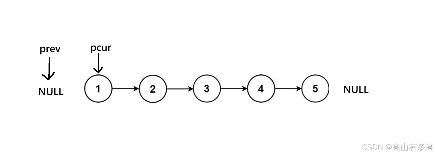 1.首先,原本初始化之后是这样的, prev 指向 NULL, pcur 指向head。 我们要明确一点,我们交换的对象只有两个 pre 和 cur。